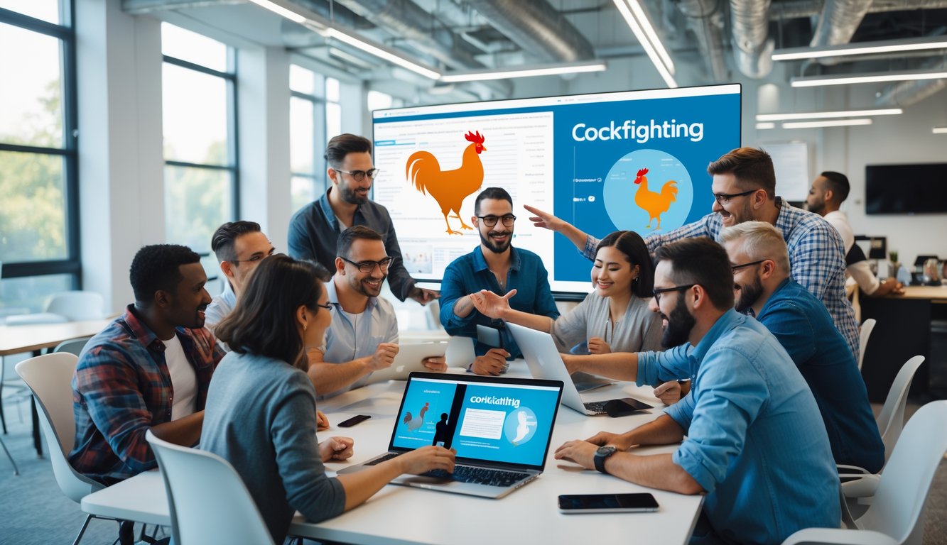 Sekelompok orang berkumpul di ruang kerja modern menggunakan perangkat digital untuk berdiskusi tentang komunitas sabung ayam secara online.